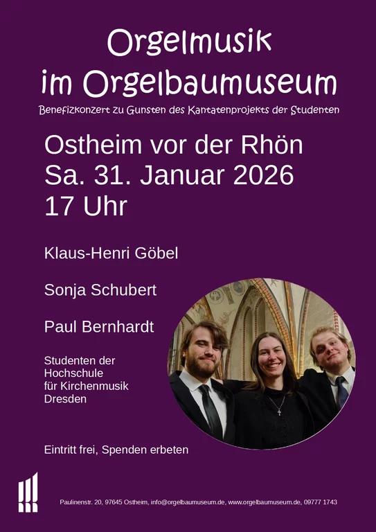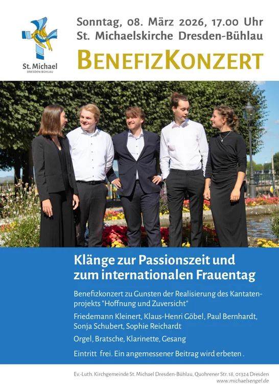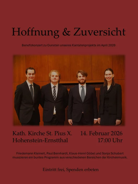 El proyecto de cantatas está diseñado y organizado por estudiantes de tercer año de la Escuela Superior de Música Sacra de Dresde. Para financiar el proyecto, se tocarán varios conciertos benéficos, que se irán anunciando aquí poco a poco. ¡Agradecemos cualquier tipo de apoyo! Si tiene alguna pregunta, puede ponerse en contacto con nosotros en la siguiente dirección de correo electrónico: info@kp26.de